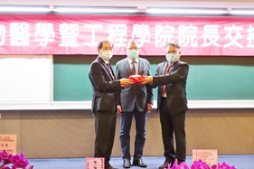 林校長感謝吳俊忠院長過去六年來對生醫工程學院的辛勞與貢獻,特別製作感謝紀念獎牌贈予吳院長,同時感謝吳院長願意暫代醫技系主任乙職,並期許在林峻立院長及各系所主管的通力合作帶領之下,未來院務必能蒸蒸日上。