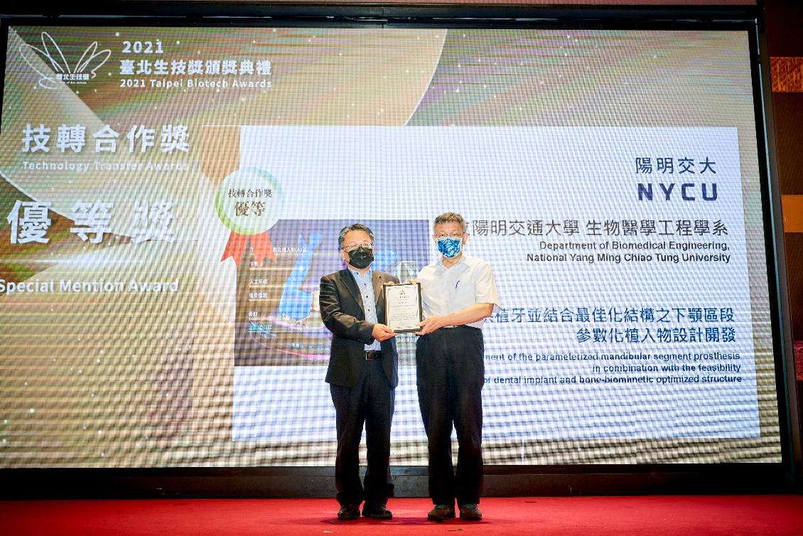 The "Design and Development of Parametric Implants for Dental Implants with Optimized Structure of the Mandibular Region" developed by Professor Lin Junli of the Department of Biomedical Engineering and Dr. Wu Zhengxian of the Department of Oral Surgery of Taipei Veterans General Hospital won the "Excellent Award for Technology Transfer Cooperation". The main theme of the research and development is to integrate CT scan, optimized structural design, computer-aided simulation analysis and metal 3DP printing technologies to develop a customized reconstructed metal implant for patients with extensive jaw bone defects, which has functional features such as segmental occlusion biomechanics, lightweight structural design and can be used with post-operative dental implants. After the company has passed the QMS certification for medical devices, the implant will enter clinical trials for the benefit of patients with extensive mandibular deficiencies, so that patients can have their jaws reconstructed with a combination of cosmetic, biomechanical, and occlusal considerations and improved quality of life.
