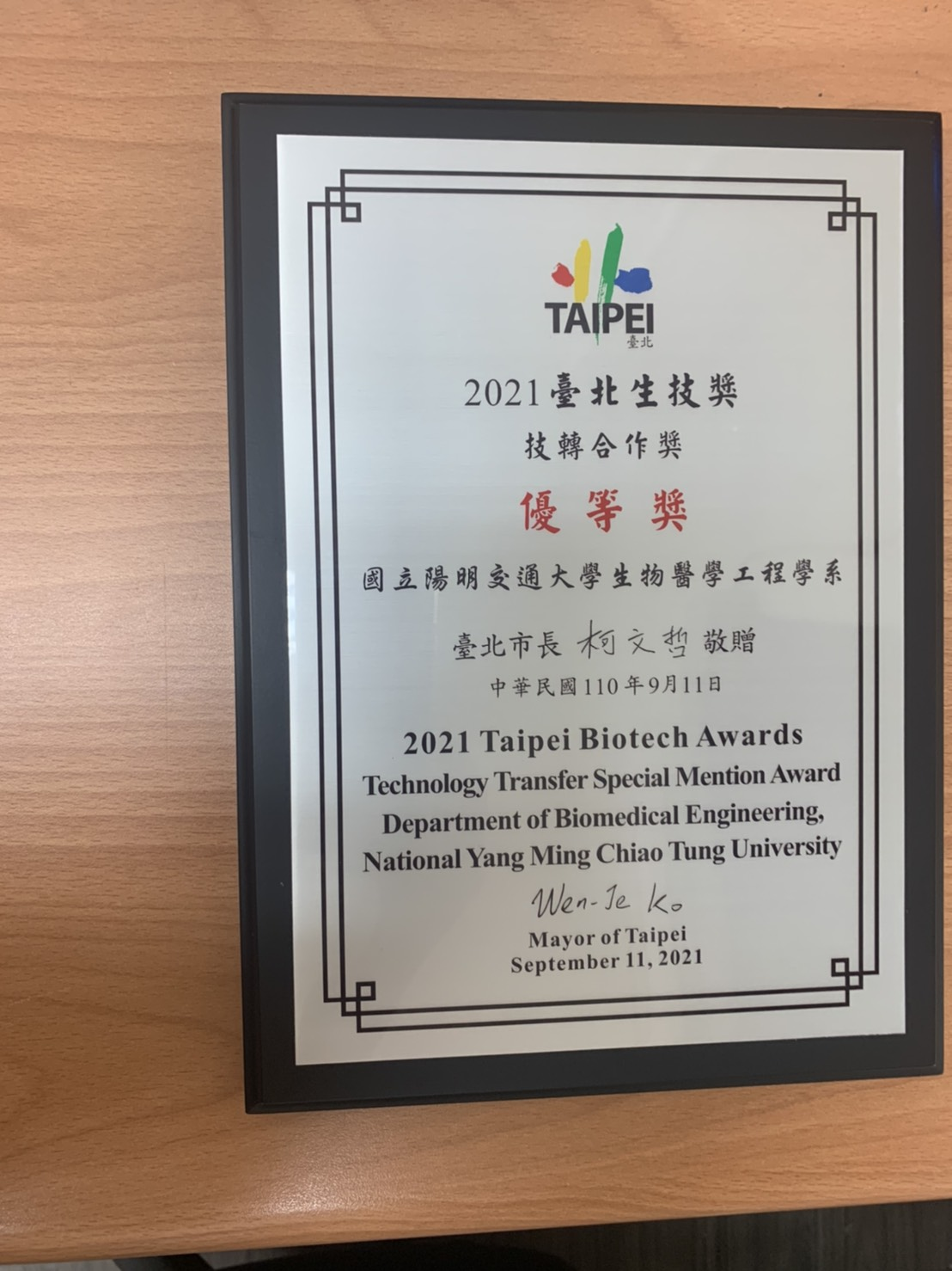 2021 Taipei Biotechnology Award Certificate